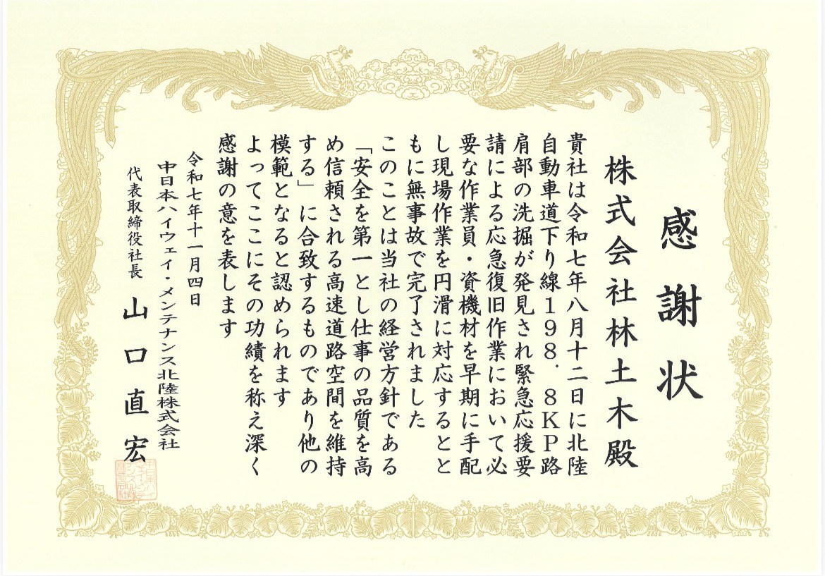 令和7年11月20日、本社にて中日本ハイウェイ・メンテナンス北陸(株)様より感謝状をいただきました。
